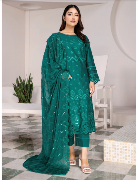 Premium Sequence Embroidered Lawn Shirt With Embroidered Crinkel Dupatta And Comfort Plain Trouser