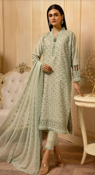 Full embroidered dobby lawn shirt with luxury embroidered chantelly crinkel dupatta and comfort plane trouser