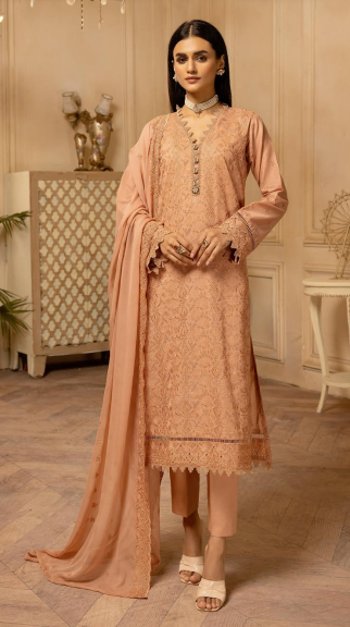 Full embroidered dobby lawn shirt with luxury embroidered chantelly crinkel dupatta and comfort plane trouser