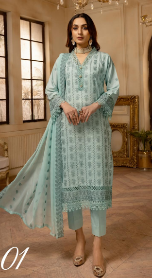 Full embroidered dobby lawn shirt with luxury embroidered chantelly crinkel dupatta and comfort plane trouser