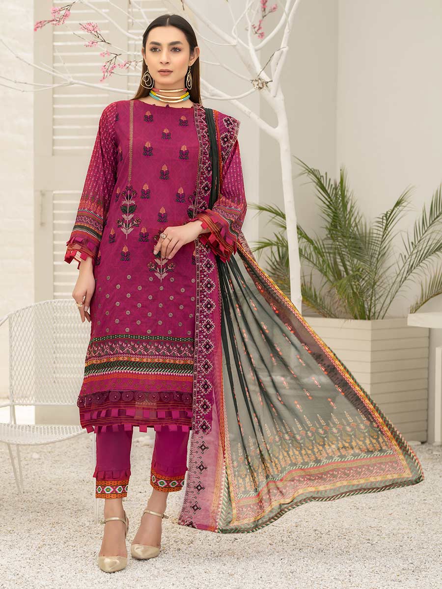 Digital Printed & Sequence Embroidered Lawn Shirt Digital Printed & Embroidered Voil Dupatta Dyed cotton trouser