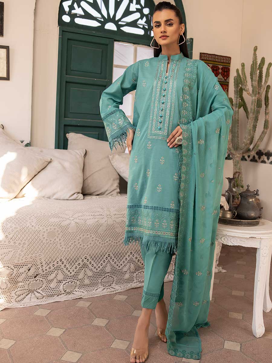 Heavy Embroidered Slub Lawn Shirt Chantilly Embroidered Peko Crinkle Dupatta Dyed cotton trouser