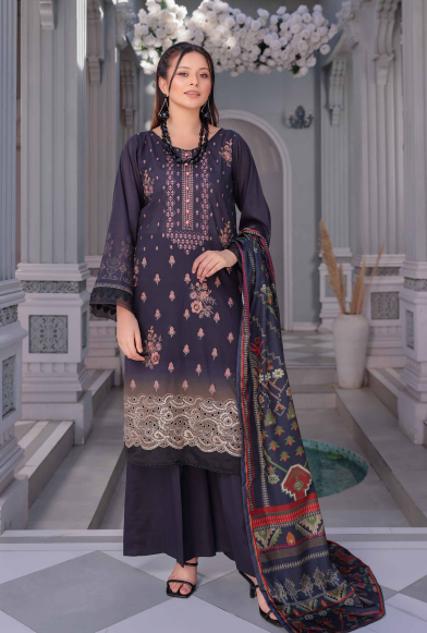 Digital Embroiderd boring daman lawn shirt with digital printed fancy silk dupatta and comfort plain trouser