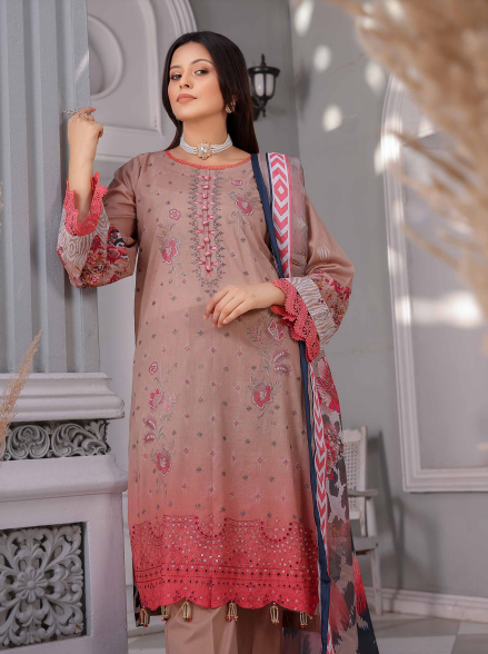 Digital Embroiderd boring daman lawn shirt with digital printed fancy silk dupatta and comfort plain trouser