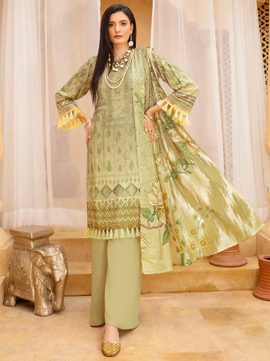 Digital Embroidered Staple Slub Shirt Digital Printed Staple Slub Shirt Back & Sleeves Fancy Zarri Dupatta Dyed Trouser...