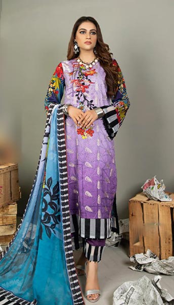 Linen Embroidered Schiffli Front Digital Printed Back & Sleeves Digital Printed Chiffon Dupatta Plain Trouser