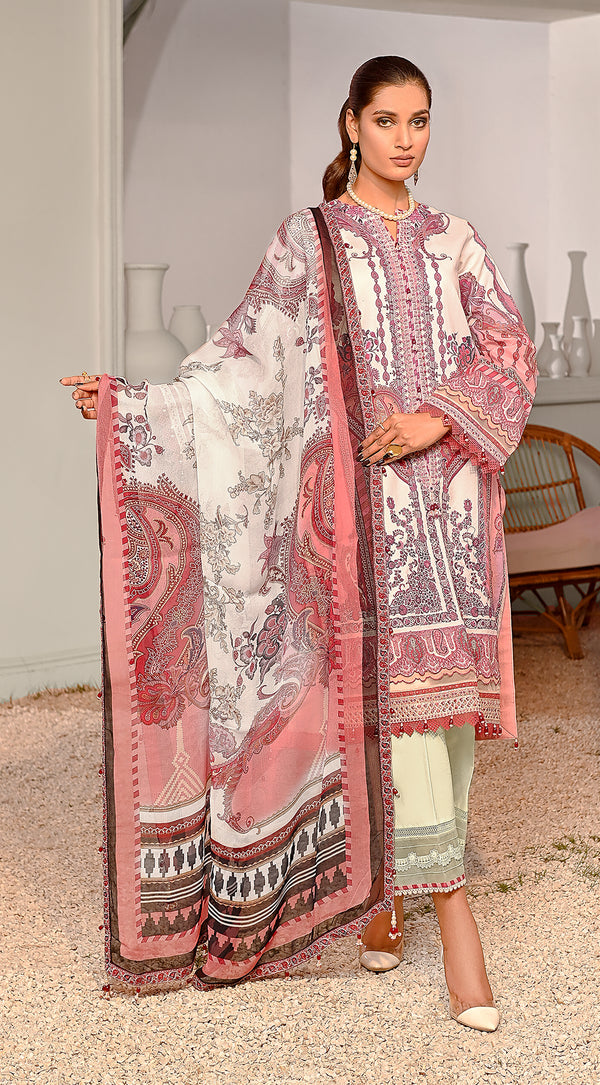 Digital Printed Chiffon Dupatta Digital Printed Lawn Shirt Dyed Cambric Cotton Trouser Embroidered Sleeve Border Embroidered Daman...