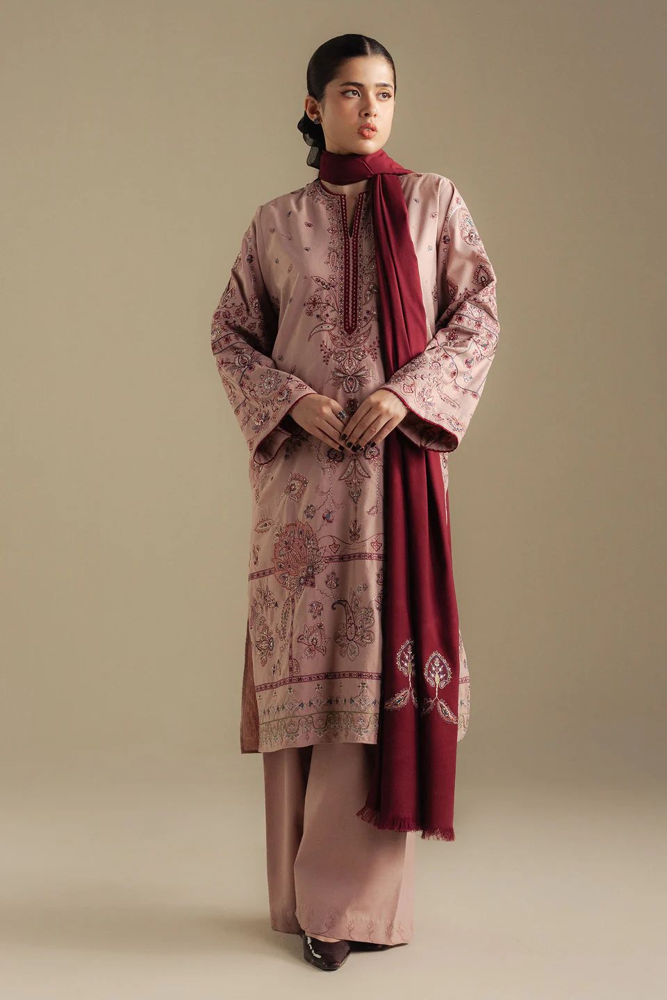 A soft salmon pink karandi shirt and trouser paired with a rosewood shawl, a graceful blend of warmth and femininity for the winter season.