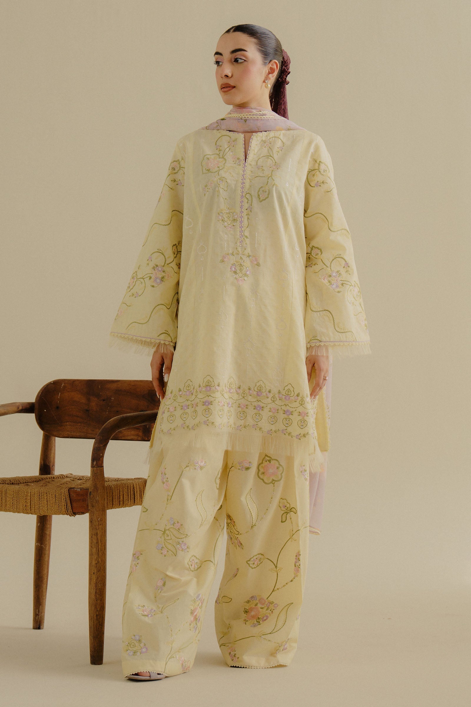 A soft buttercup yellow base adorned with delicate embossed textures and fine tonal embroidery, capturing a light and effortless elegance, finished with a breezy chiffon dupatta for a graceful touch.