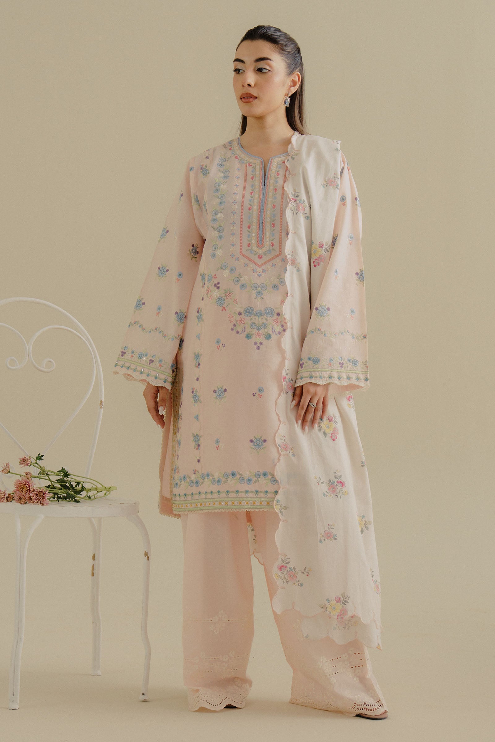 The peachy pink jacquard, paired with a jacquard dupatta and composed embroidery, creates a soft yet sophisticated look with intricate detailing.