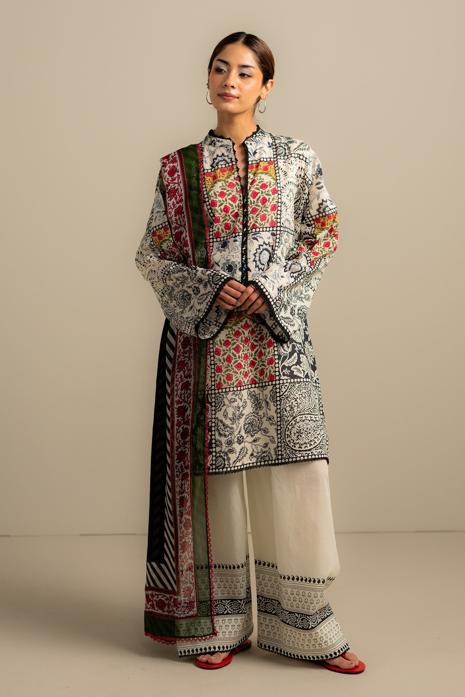 A charcoal-toned shirt with off-white pants and a breezy chiffon dupatta—minimal, moody, and effortlessly refined.
