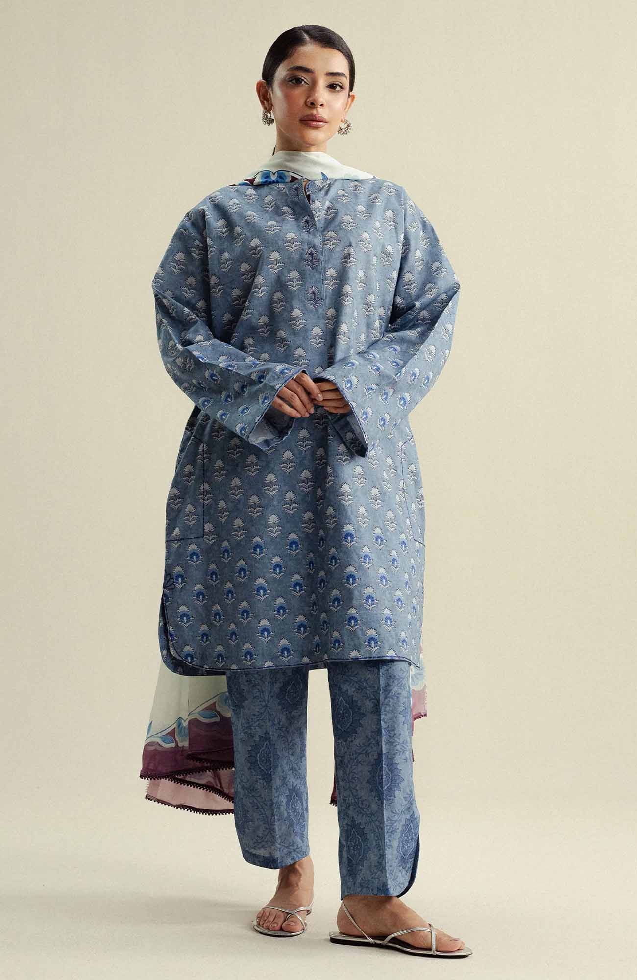 A serene celadon blue shirt paired with a printed trouser and an ice blue dupatta, a cool-toned duet that feels airy and refined.