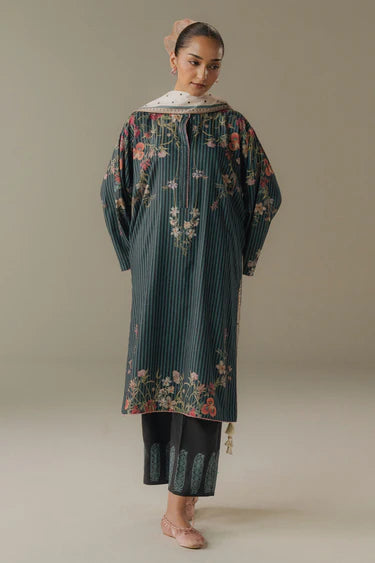 A teal and gray striped shirt inspired by floral elements, paired with a soft gray trouser featuring intricate paisley motifs. The ensemble is beautifully tied together with an off-white shawl adorned with classic black polka dots, creating a refined and versatile look.