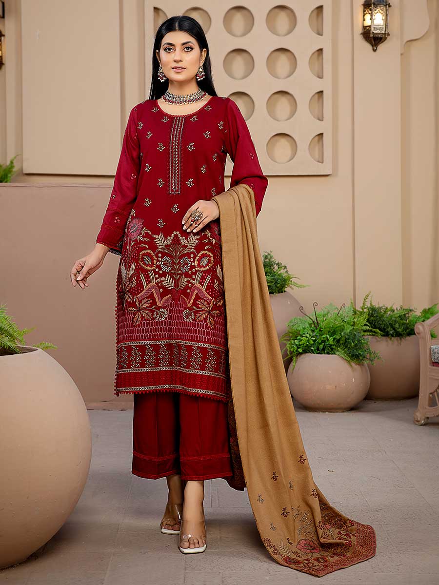 Embroidered Dhanak Bindi Shirt Dhank Back & Sleeves Contrast Embroidered Wool Shawl Dyed Trouser
