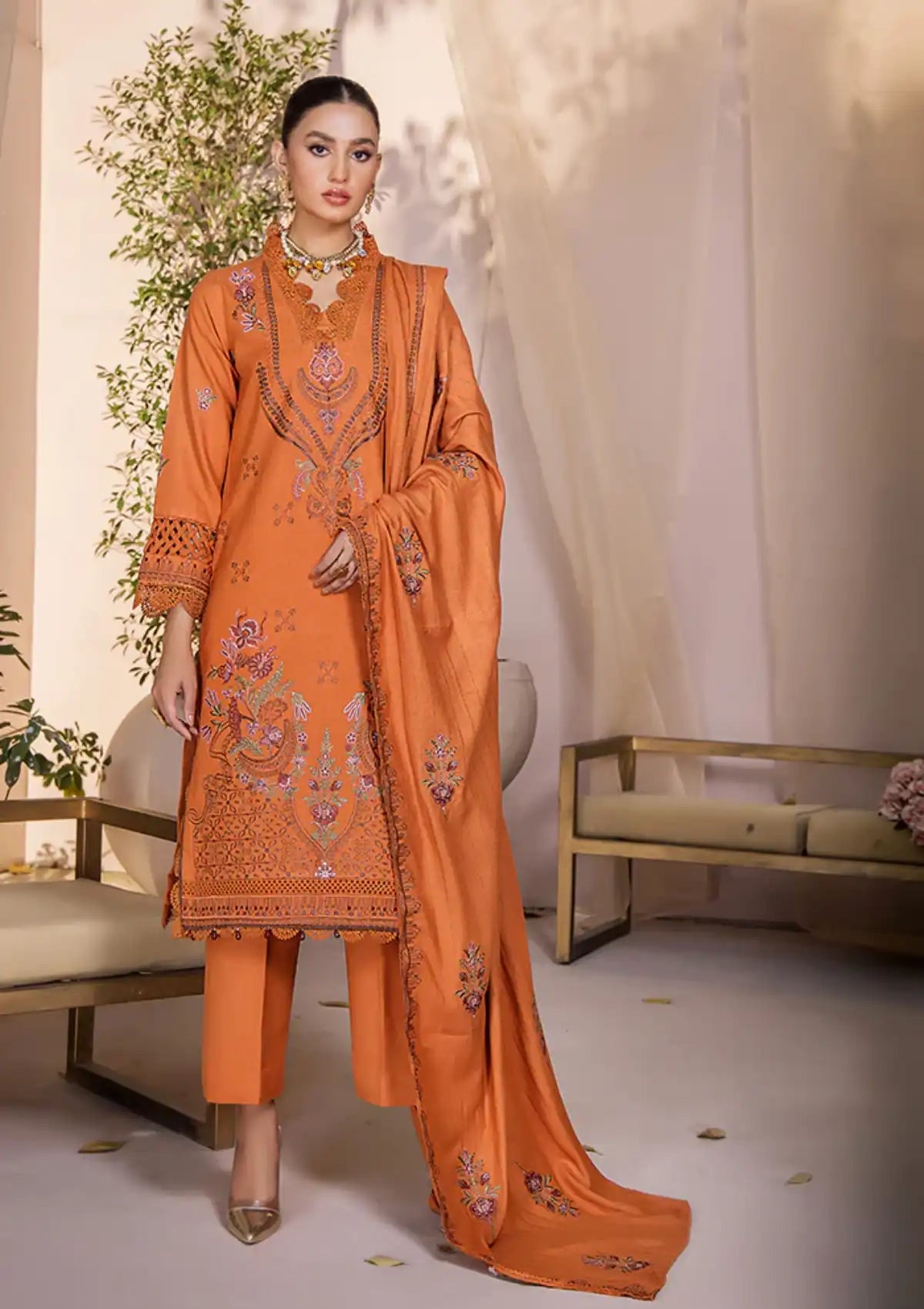 Embroidered Peach Shirt 3 M Peach Embroidered Shawl 2.5 Plain Peach Trouser 2.5 M
