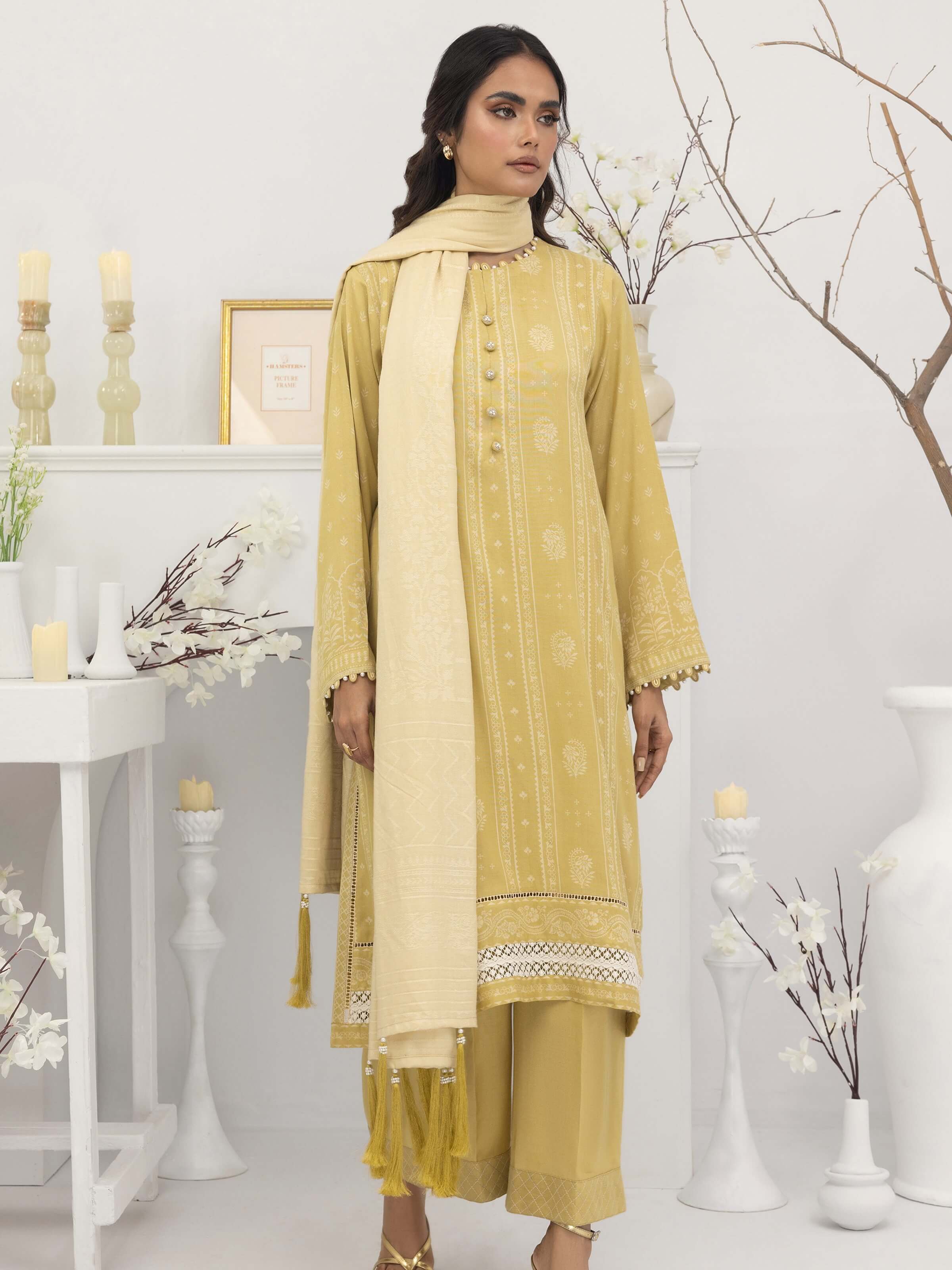 Dupatta: Fancy Self Jacquard Shawl Shirt Front: Printed 01 Piece Shirt Back: Printed 01 Piece Sleeves: Printed 01 Pair Trouser: Dyed 01...