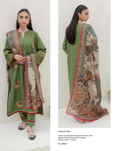 Dyed Embroidered Textured Shirt  Digital Printed Tennis Net Dupatta  Dyed Cambric Trouser