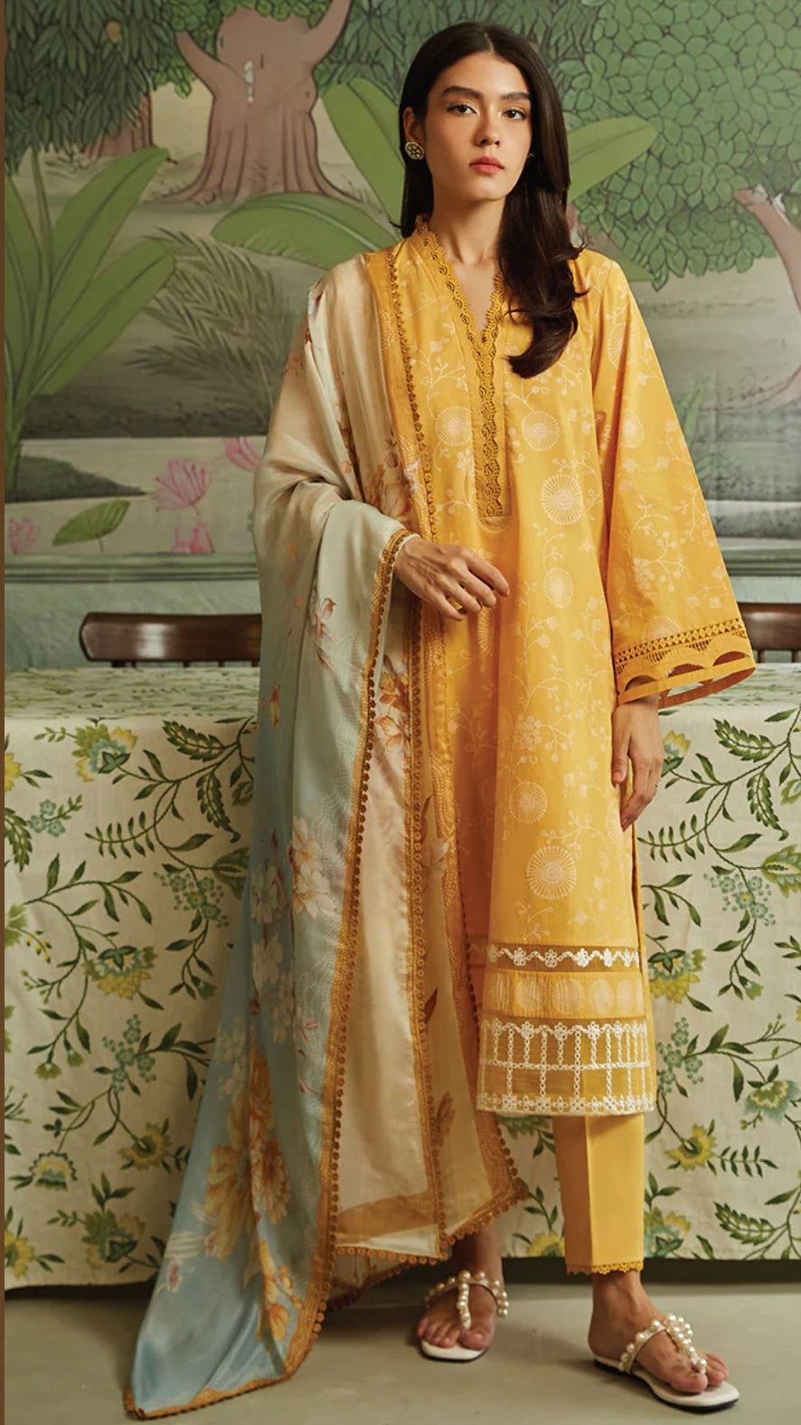 SHIRT -Digital printed cambric shirt -1 embroidered neckline -40" embroidered patti for hem TROUSER -Dyed cambric trouser...