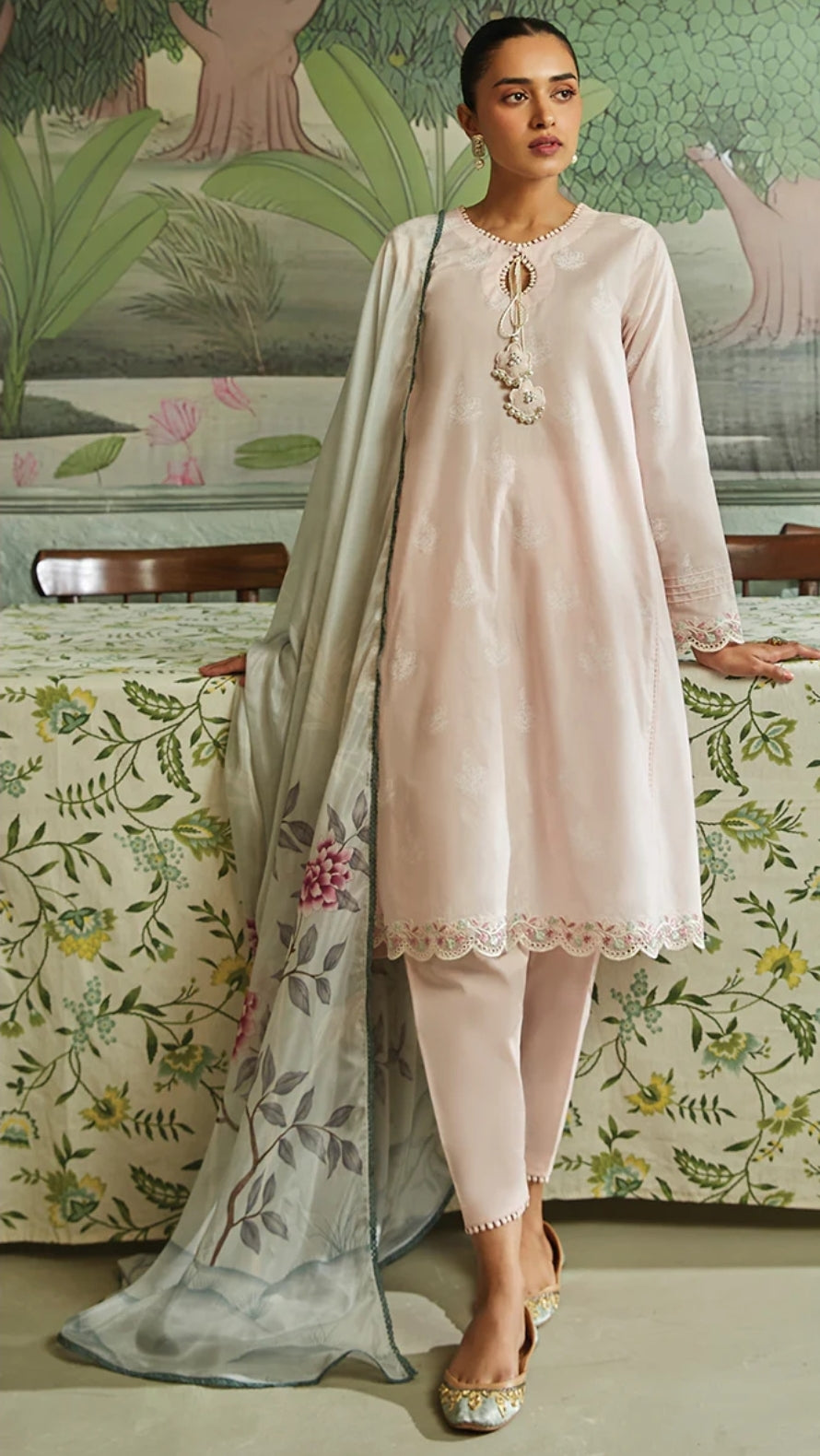 SHIRT -Paste printed cambric shirt -80" embroidered patti for shirt TROUSER -Dyed cambric trouser DUPATTA -Silk digital...