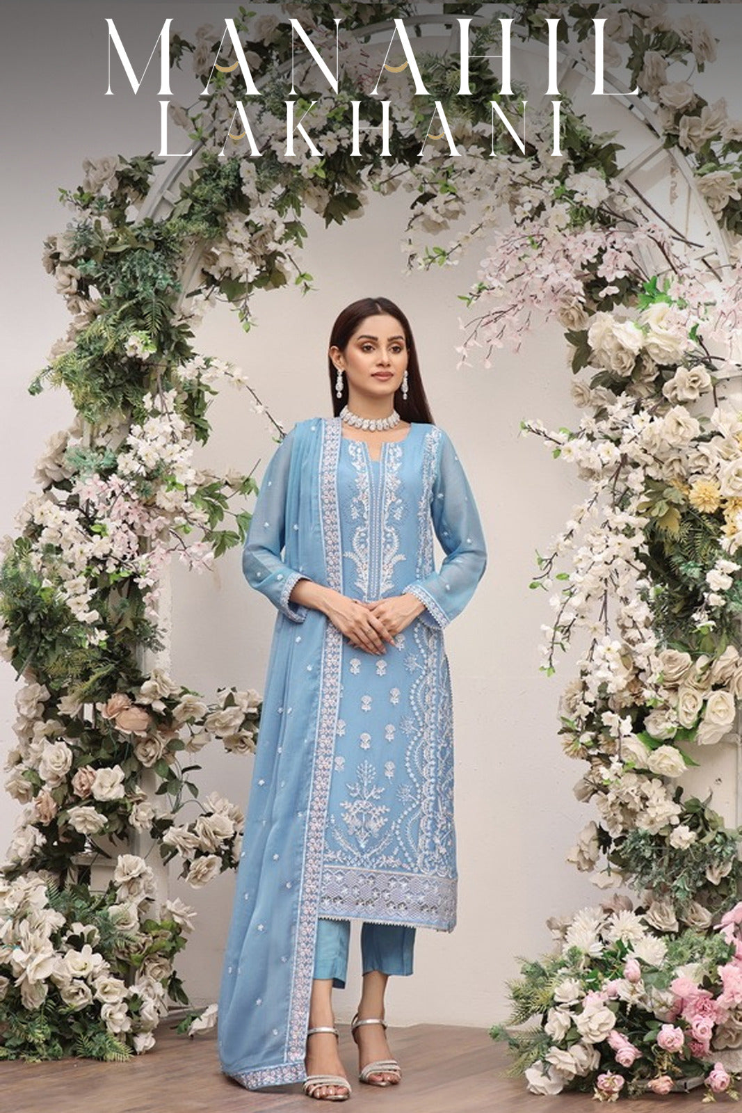 Embroidered Chiffon Front Plain Chiffon Back  Embroidered Chiffon Sleeves Embroidered Chiffon Dupatta Embroidered Front And Back Laces...
