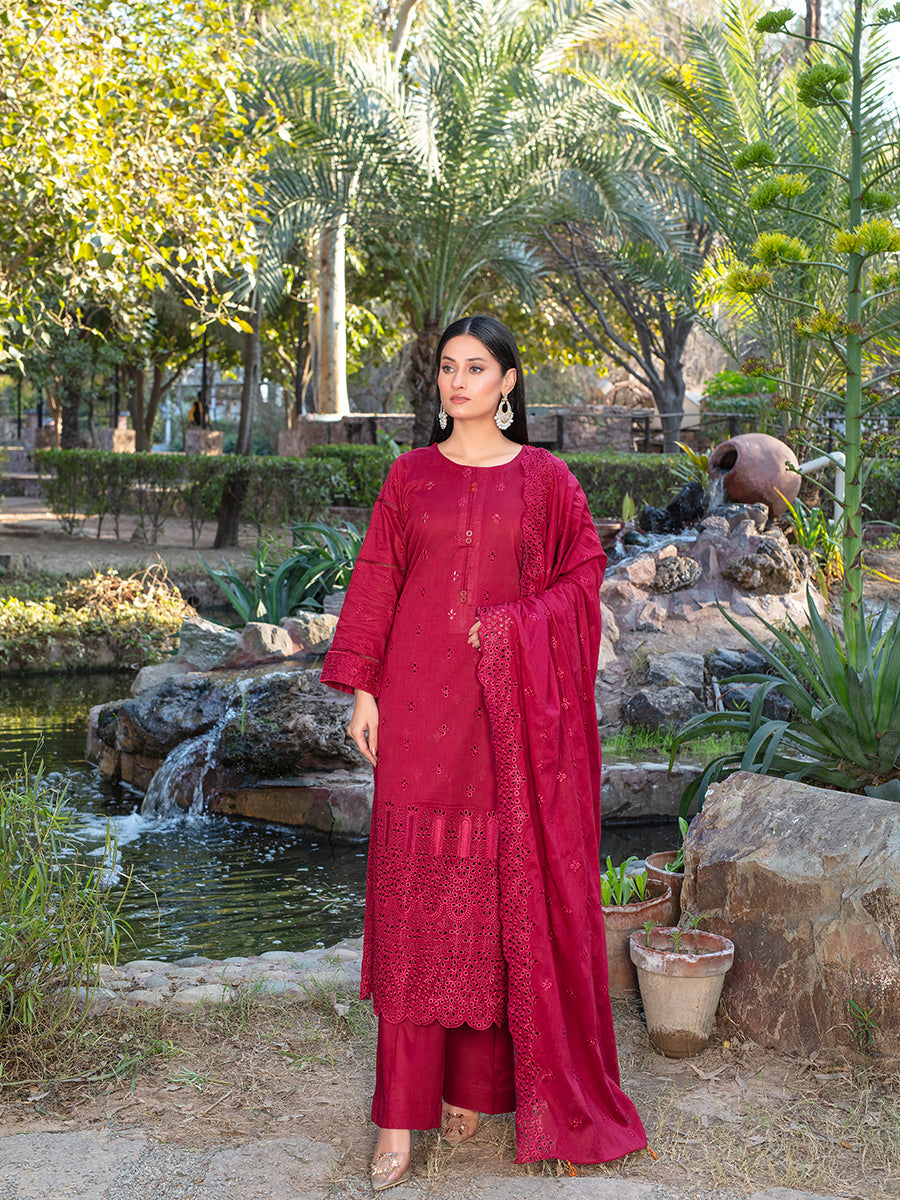 -Luxury Dyed Embroidered Lawn Front-Luxury Dyed Embroidered Back and Sleeves-Luxury Dyed Embroidered Voil Dupatta -Dyed Cambric Trouser