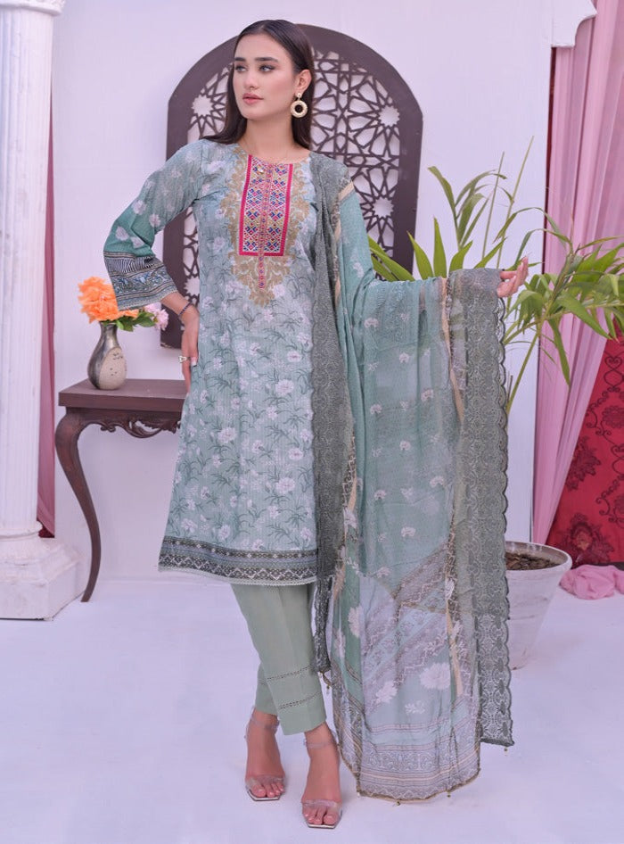 DIGITAL PRINTED STRIPE EMBROIDERED SHIRT. DIGITAL PRINTED BAMBER CHIFFON CHIKANKARI CUTWORK DUPATTA PLAIN DYED TROUSER.