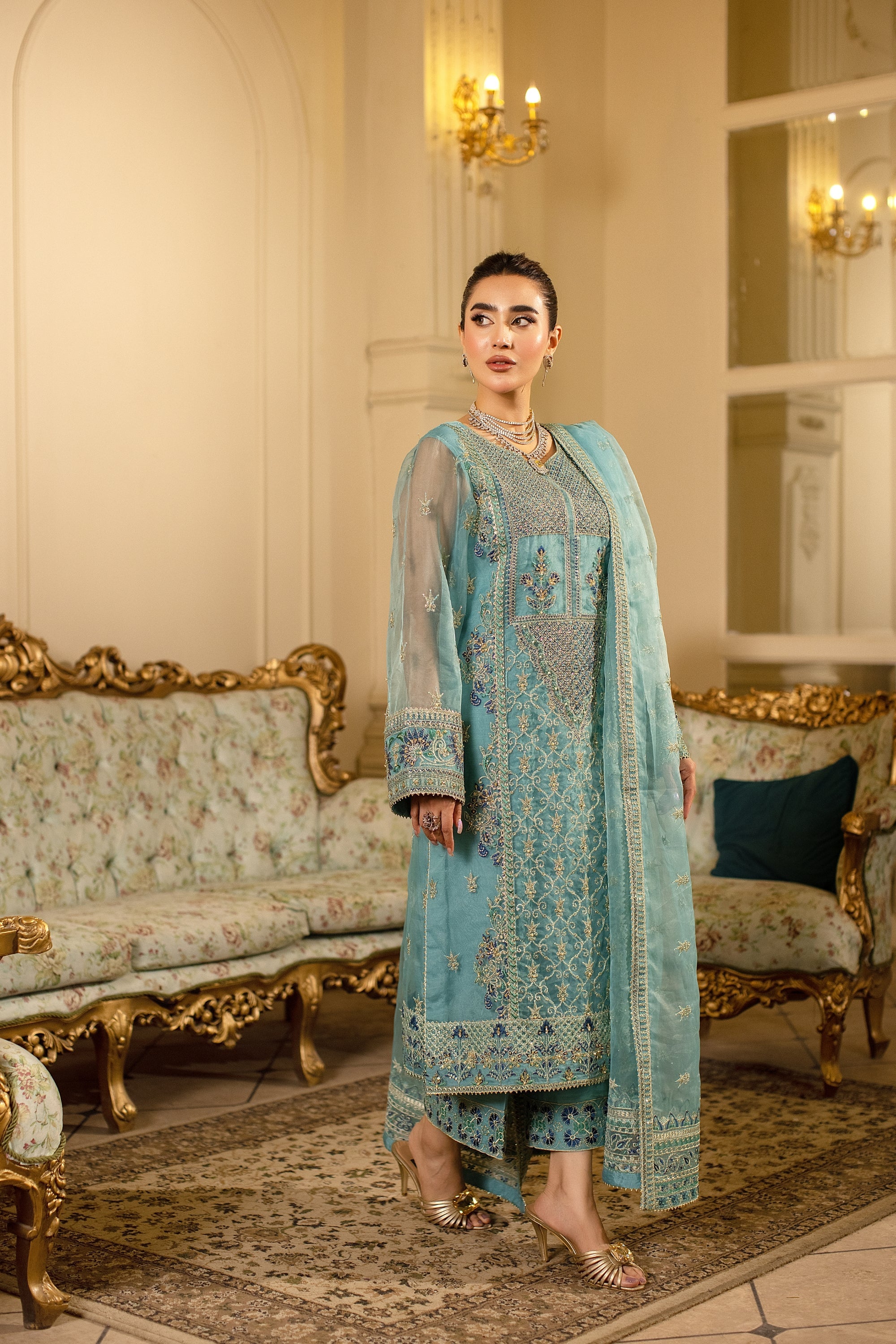Inspired by the calm of water, Aquessence is crafted on fine organza with a hand-embellished front and detailed panels. The look is enhanced with embroidered sleeves, luxe organza borders, and a flowing embroidered dupatta. Paired with raw silk trousers, this teal ensemble is pure sophistication.