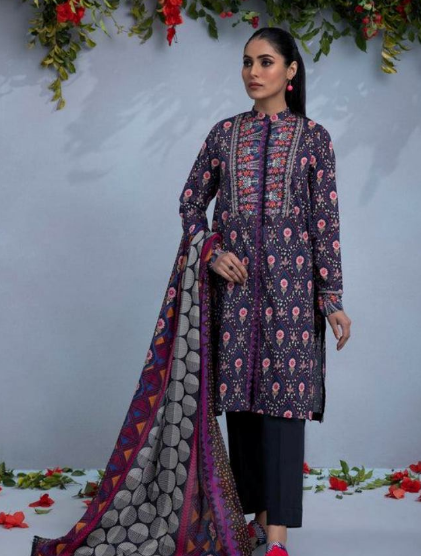 3PC Printed Lawn Shirt Printed Voile Dupatta Dyed Cotton Trousaers