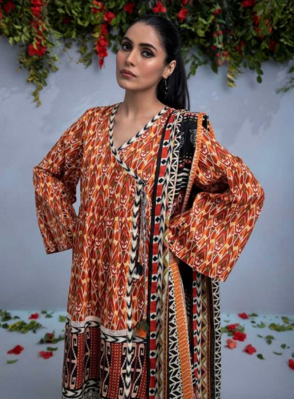 3PC Printed Lawn Shirt Printed Voile Dupatta Dyed Cotton Trousaers