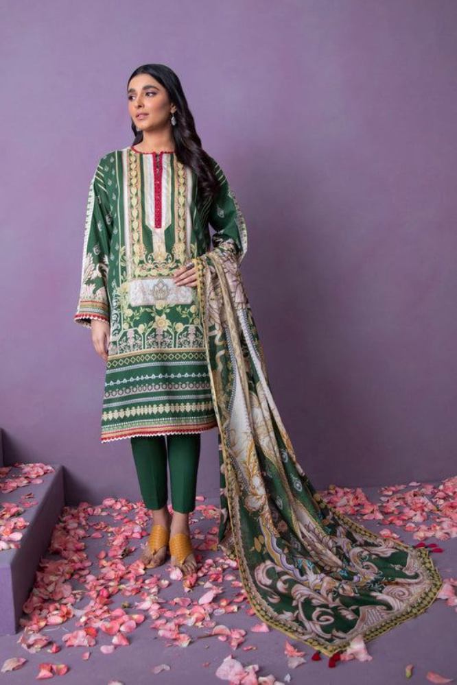 3PC Printed Lawn Shirt Printed Voile Dupatta Dyed Cotton Trousaers