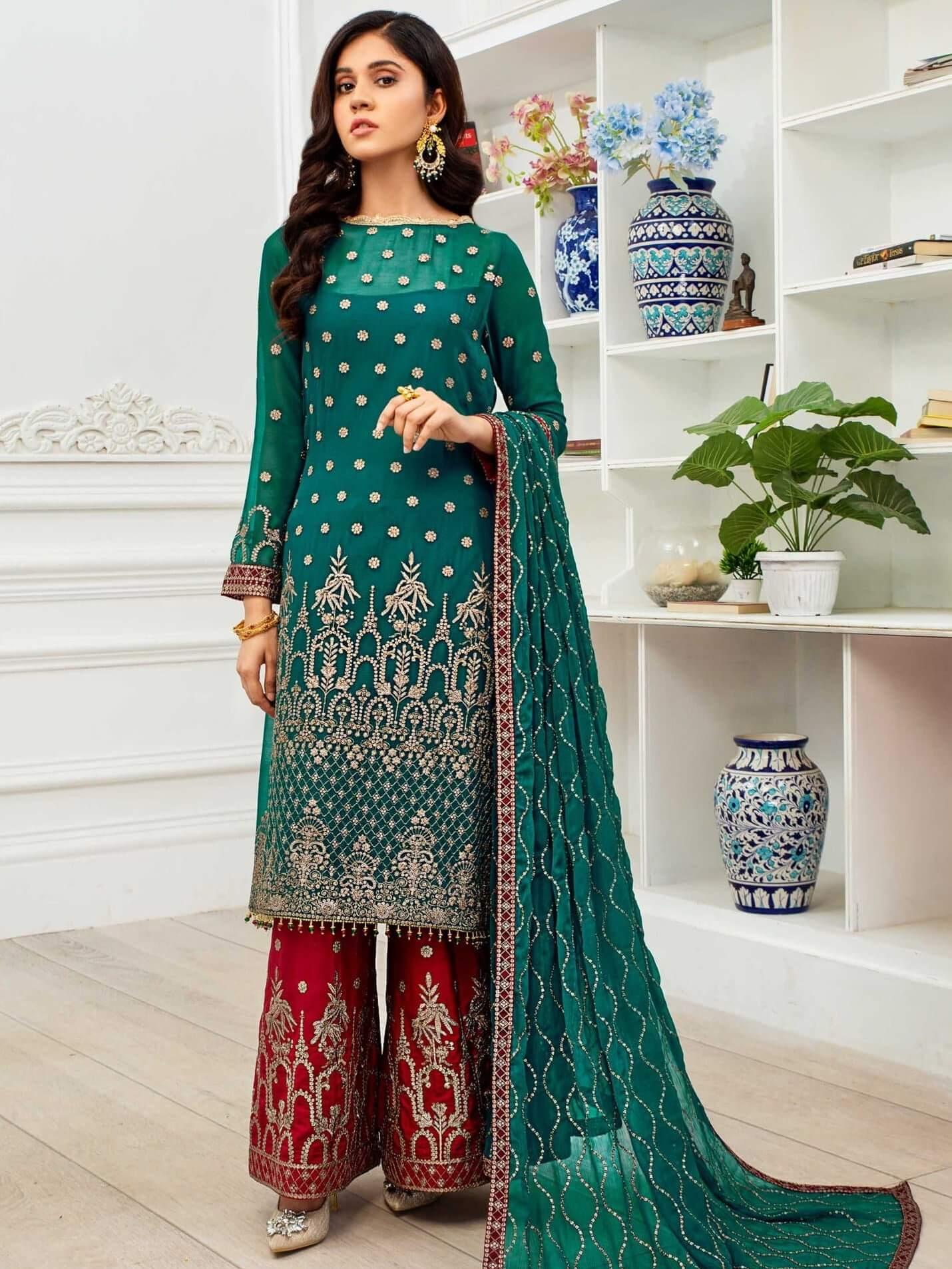 Shirt Front & Back Sequined Embroidered Chiffon Sleeves Sequined Embroidered Chiffon Dupatta Sequined Embroidered Chiffon  Four Side...