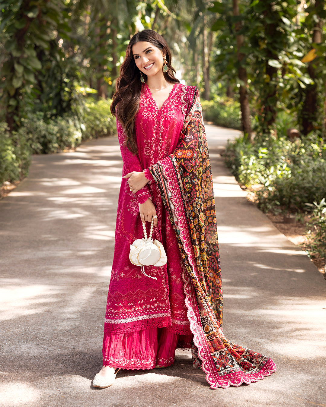 Showcasing a visual symphony, Verda is a spectacular pink shirt featuring floral motifs accented with lavish resham in lighter tones of the base shade. Richly detailed motifs for the front can be used to grace the shirt hem lending the outfit textural intrigue. Bold floral compositions adorn the silk dupatta and the delicately embroidered trousers add an element of artistic finesse to the outfit.